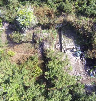 Aerial photo: The two sections of the tye are plainly seen here with the tye channel to the left of the granite floor (long, tapered section). The two settlement pits are the darker areas to the right. We are currently excavating the opened areas to the left of the photograph.